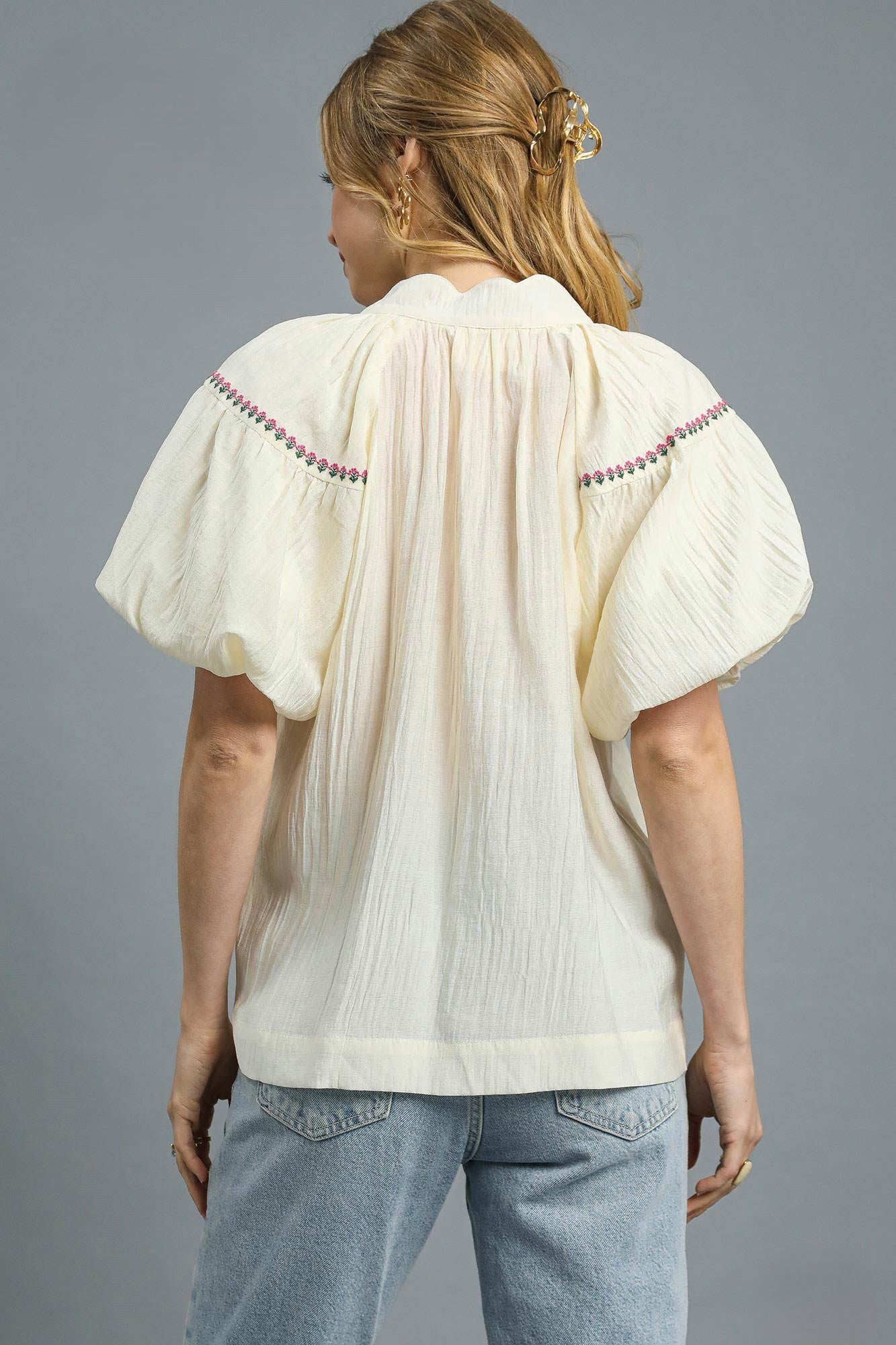 Elevate your wardrobe with the Muriel Emb Puff Top, featuring a flattering V-neckline with delicate shoulder pleating and charming short puff sleeves. The vibrant floral embroidery adds a touch of elegance and personality to this versatile piece. Crafted from a luxurious rayon-blend fabric with polyester and nylon for durability and comfort, this lined top transitions seamlessly from casual outings to special occasions. Perfect for spring and summer styling.